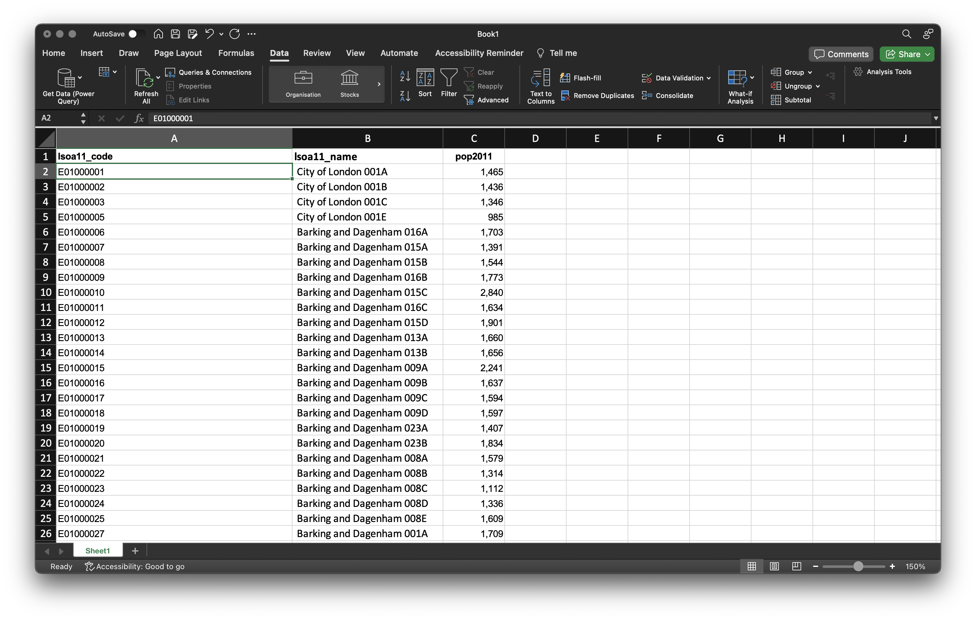 Open the LSOA2011-population.xlsx file in Excel. We have two main columns: one with identifying information that distinguishes each area from one another and one with population counts. In addition, there are some less informative rows at the top of the spreadsheet. To prepare the data we need to take several steps.