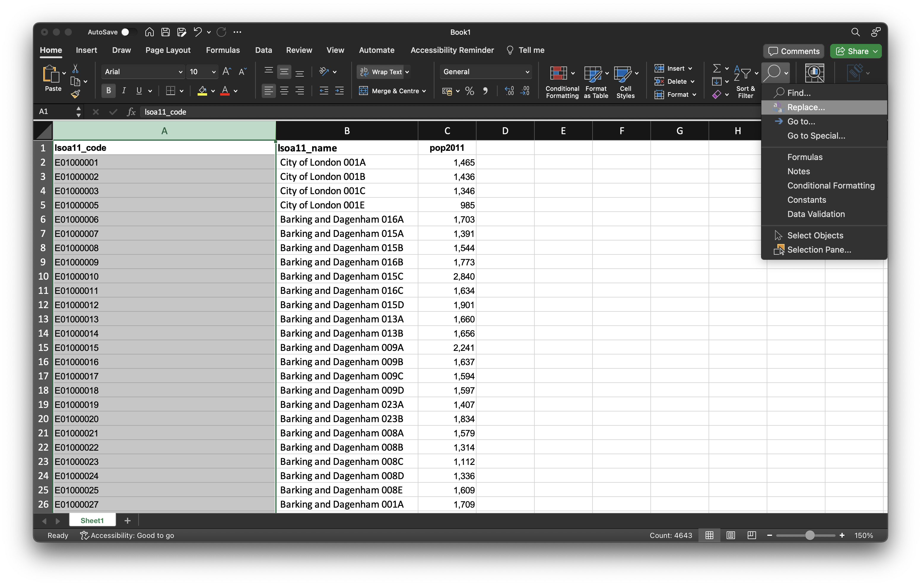 lsoa11_code column. These spaces are not immediately noticeable, as they appear at the end of the LSOA codes without any visible characters following them. Although this may seem minor, it can cause problems when using the data. To fix this, highlight the entire lsoa11_code column, go to the Home menu, and select Replace under the Find & Select menu.