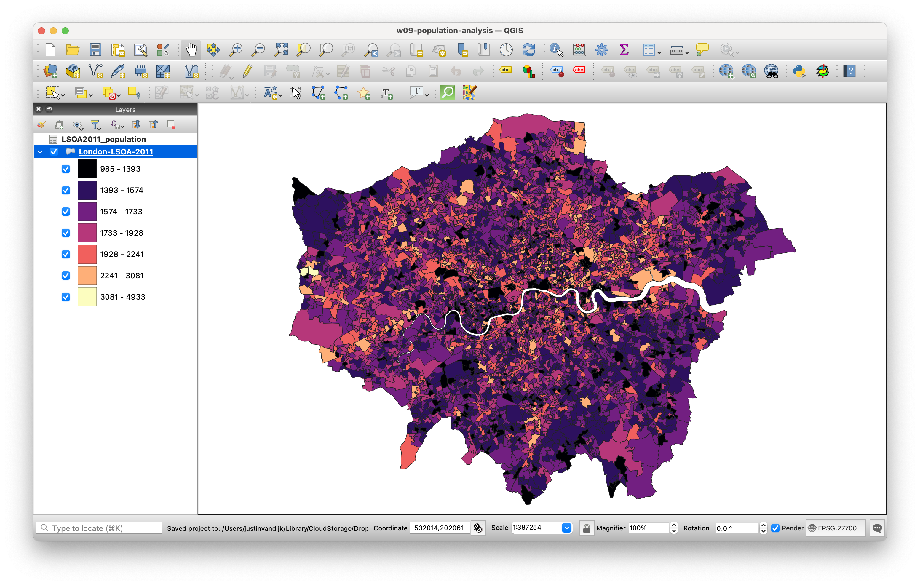 London-LSOA2021.gpkg into QGIS.LSOA2021-population.csv into QGIS.Paste the exported map into the appendix of your assignment, include a few sentences interpreting the results. Consider whether there are any noticeable changes in the population distribution between 2011 and 2021.