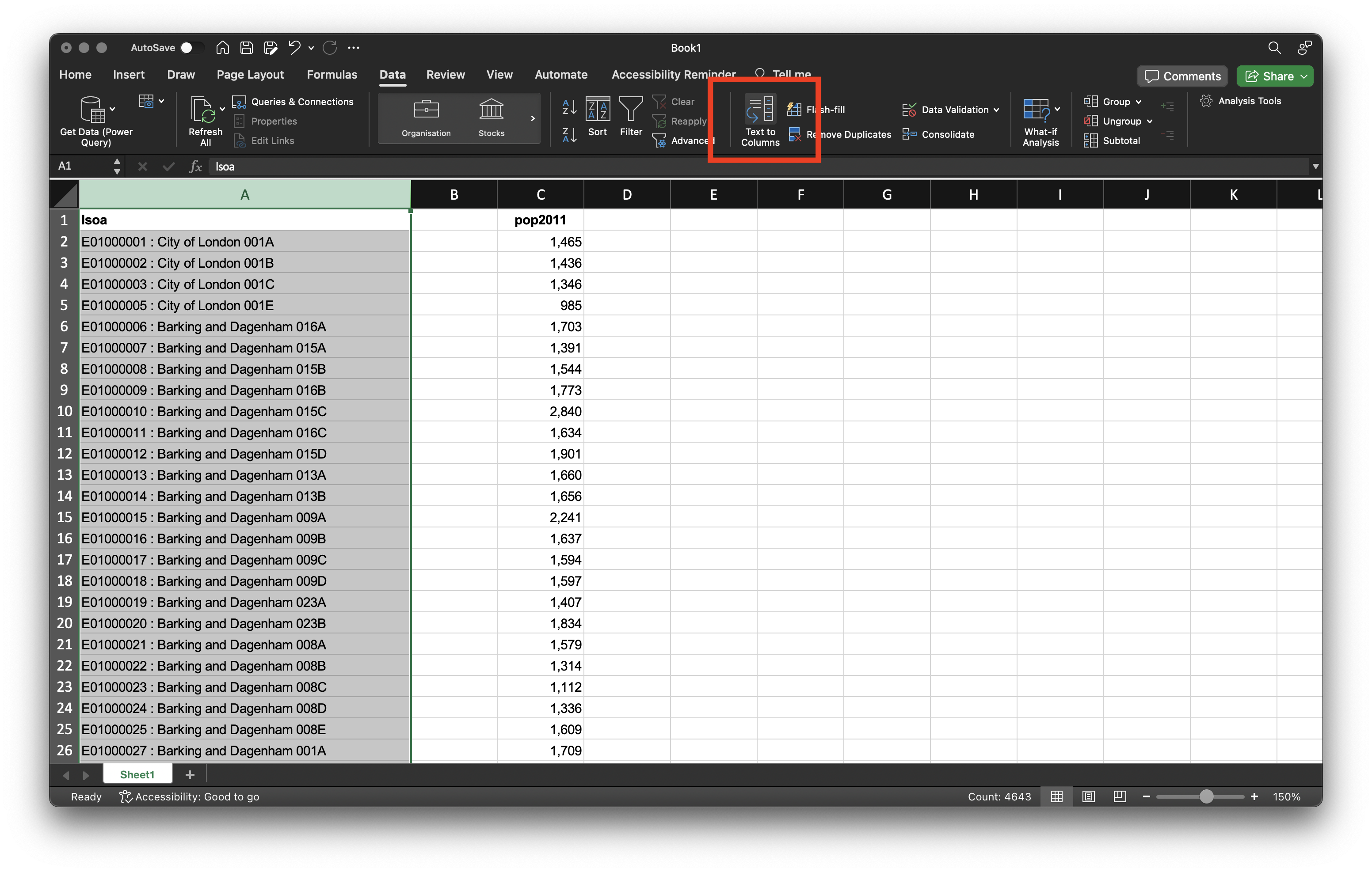 lsoa and pop2011, respectively.pop2011 column that is stored in column B and paste these into column C. You now should have a column without any data sat between the lsoa and pop2011 columns.lsoa column and in the Data menu click on the Text to Columns menu button.
